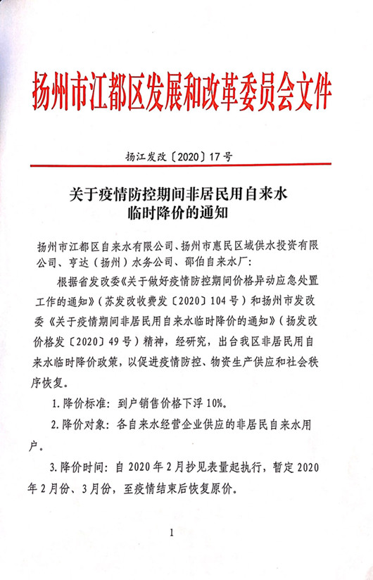 關于疫情防控期間非居民用自來水臨時降價的通知