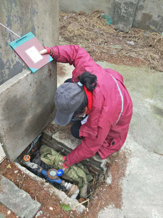 2月21日上午,多云。朱師傅頭戴鴨舌帽,佩戴口罩,膠手套,穿著雨衣,做好個人防護措施,帶著抄收賬簿、分揀好的發(fā)票、手電筒、撬棒來到二姜區(qū)域,開始“抄收復工”。“你是誰,廠子還沒復工,領導沒來呢!”二姜四方電鍍廠門衛(wèi)一開始沒認出全副武裝,只露出兩只眼的朱師傅,很警惕。“姜師傅,您好!我是抄表員小朱,來看看急降溫后廠子供水是否正常運行,順便抄表。”朱師傅配合好鞋底消毒和體溫槍測量體溫后,先在廠子里巡查一圈,未發(fā)現(xiàn)漏水現(xiàn)象,然后來到廠西南角水表處,她嫻熟地打開水表井,“表深要確保表讀數(shù)精確,避免用戶不滿意”,她一邊嘀咕著一邊左手拿出手電筒照明,右手用紙手帕擦拭去水表玻璃上的污垢,認真讀表,確認讀數(shù)“7078m³”。
