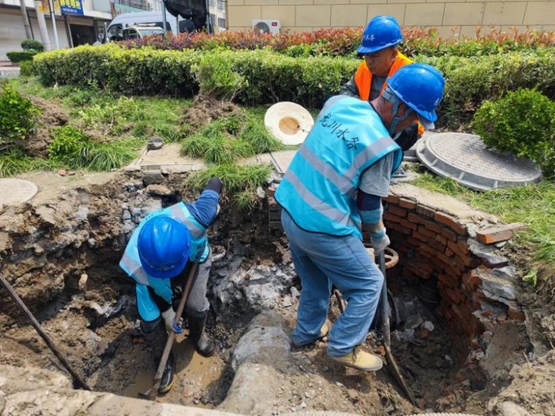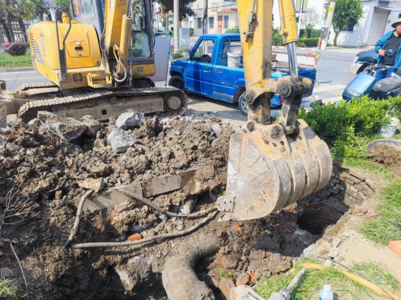 此次維修的是老水廠鋪設(shè)的DN200的PVC管道,但在施工過程中遇到了較多困難,當(dāng)挖掘機(jī)破開路面時(shí),發(fā)現(xiàn)需要破除80公分左右厚度的混凝土,但中間是DN300的鋼管,漏點(diǎn)卻在鋼管下方的PVC管與球管連接處,這無疑給施工增加了很大的難度。挖掘機(jī)施工時(shí),稍有不慎就會(huì)破壞中間鋼管,只能通過手動(dòng)一邊用風(fēng)鎬、洋鎬等進(jìn)行破碎,一邊用鐵鍬進(jìn)行開挖,同時(shí)還需要抽水作業(yè)。由于當(dāng)天室外氣溫高達(dá)34攝氏度,烈陽高照,汗水早已浸濕了現(xiàn)場施工人員的衣服,但他們不怕苦、不怕累,克服各種困難,通過3個(gè)小時(shí)不間斷地?fù)屝蓿罱K完成這段老舊管道的維修更換。