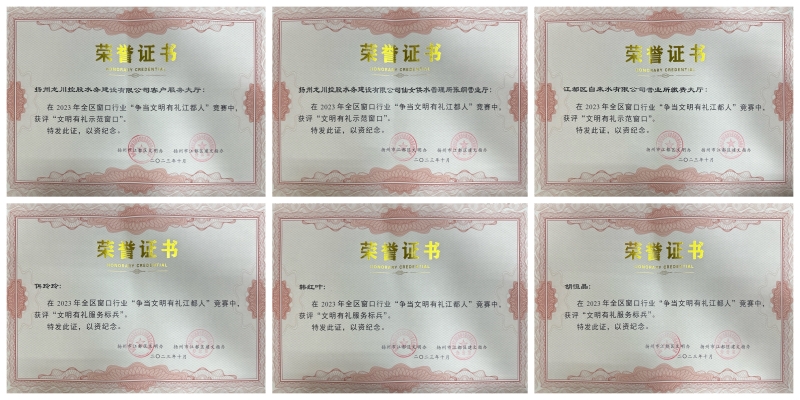 近日,揚(yáng)州龍川水務(wù)榮獲多項(xiàng)榮譽(yù)表彰——揚(yáng)州市江都區(qū)文明辦、揚(yáng)州市江都區(qū)建設(shè)全國(guó)文明城市指揮部辦公室聯(lián)合授予揚(yáng)州龍川水務(wù)客戶(hù)服務(wù)部客服大廳、下屬自來(lái)水公司營(yíng)業(yè)所繳費(fèi)大廳、下屬惠民公司仙女供水管理所張綱營(yíng)業(yè)廳“文明有禮示范窗口”榮譽(yù)及公司員工佴玲玲、韓紅葉、胡恒晶“文明有禮服務(wù)標(biāo)兵”稱(chēng)號(hào)。