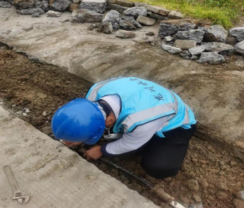 12月19日上午8點,南片維修所接到客服報修,反映宜陵鎮(zhèn)七里張營紅綠燈處挖機挖路導(dǎo)致管道破裂漏水嚴重,且漏水點在路邊,行人來往頻繁,存在安全隱患。我片區(qū)維修作業(yè)人員喬金于立即趕往現(xiàn)場查看,經(jīng)過實地查勘,最終探明漏水原因是PVC32管道破裂。隨后,喬金于不顧天氣寒冷,脫掉厚外套,穿上雨靴,立即開展搶修工作。零下的寒冬里,路上的行人包裹得嚴嚴實實,但搶修管道的工作人員沒有絲毫懈怠,干得熱火朝天,汗水打濕了衣服。喬金于先用鐵鍬一鍬一鍬的挖開泥土,把管道暴露出來,隨即雙腳站在泥土中,用角鋸鋸開管道,對破損的PVC32管更換伸縮節(jié)。經(jīng)過一套行云流水般的操作,此次搶修工作圓滿完成,恢復(fù)正常供水。